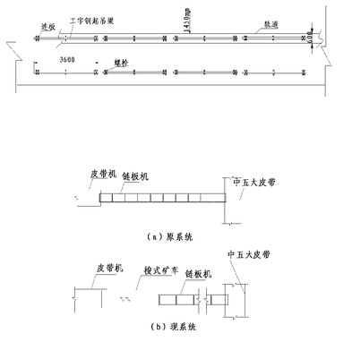 (2)梭式礦車(chē)整體遷移在梭式礦車(chē)整體安裝、試運(yùn)轉(zhuǎn)正常后,使用起吊梁配合5t的手拉葫蘆,將皮帶機(jī)頭整體向后移動(dòng)12m,在移動(dòng)過(guò)程中要求各拉葫蘆拉力要調(diào)配好 ,保證整個(gè)機(jī)頭的完整性。移動(dòng)結(jié)束后再用方木將皮帶機(jī)頭墊高 500mm。使用起吊梁、配合5t手拉葫蘆將梭式礦車(chē)移至原皮帶機(jī)頭位置(因梭式礦車(chē)是在原軌道上組裝,在遷移梭式礦車(chē)過(guò)程中為防止摩擦對(duì)梭式礦車(chē)和軌道的損壞,梭式礦車(chē)下方墊長(zhǎng)木料加以保護(hù))。完成皮帶機(jī)與梭式礦車(chē),以及梭式礦車(chē)與鏈板機(jī)的合理搭結(jié)、調(diào)試、運(yùn)轉(zhuǎn)。如圖2 。