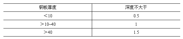 6 焊縫應均勻平整,不應有裂紋、夾渣、燒穿、未焊透等缺陷。重要部位的焊縫還不應有氣孔,且咬肉長度不得超過焊縫長度的15%,咬肉深度應符合表1的規(guī)定。