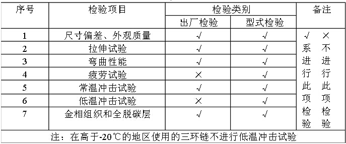 12.4.2 表4中的序號2、3、4、和5為主要項目,主要項目的允許復(fù)檢項目數(shù)為 1項,經(jīng)加倍數(shù)量復(fù)檢仍有一掛 (件)不合格,則判定該批三環(huán)鏈為不合格。