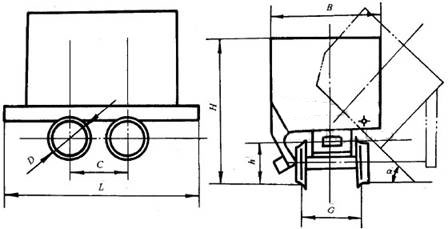 5.1.2 逐輛測(cè)定礦車的主要參數(shù):外形尺寸(長(zhǎng)、寬、高)、軸距、牽引高、輪對(duì)軌距和卸載角。